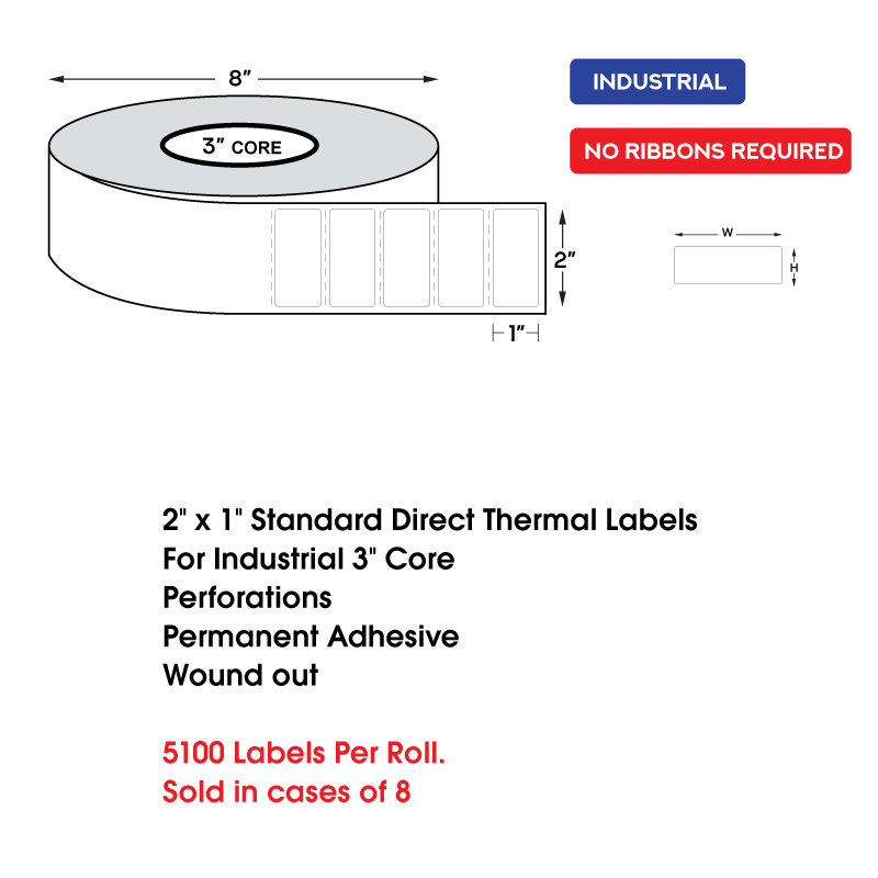 2″ x 1″ Standard Direct Thermal Labels on 3″ Core, Perforations, Wound Out, Permanent Adhesive (5100 Labels Per Roll)