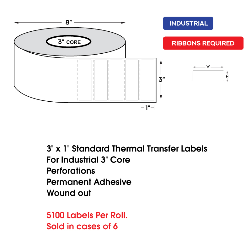 3″ x 1″ Standard Thermal Transfer Labels on 3″ Core, Perforations, Wound Out, Permanent Adhesive (5100 Labels Per Roll)