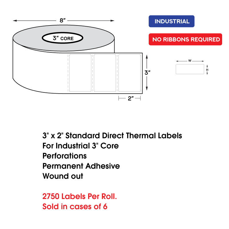 3″ x 2″ Standard Direct Thermal Labels on 3″ Core, Perforations, Wound Out, Permanent Adhesive (2750 Labels Per Roll)