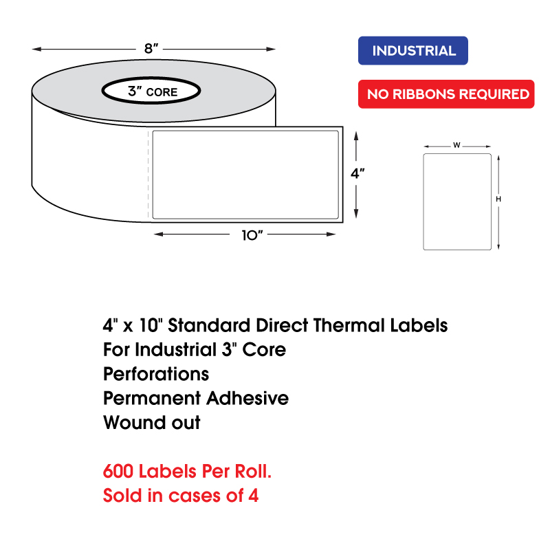 4″ x 10″ Standard Direct Thermal Labels on 3″ Core, Perforations, Wound Out, Permanent Adhesive (600 Labels Per Roll)