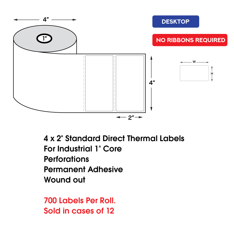 4″ x 2″ Standard Direct Thermal Labels on 1″ Core, Perforations, Wound Out, Permanent Adhesive (700 Labels Per Roll)