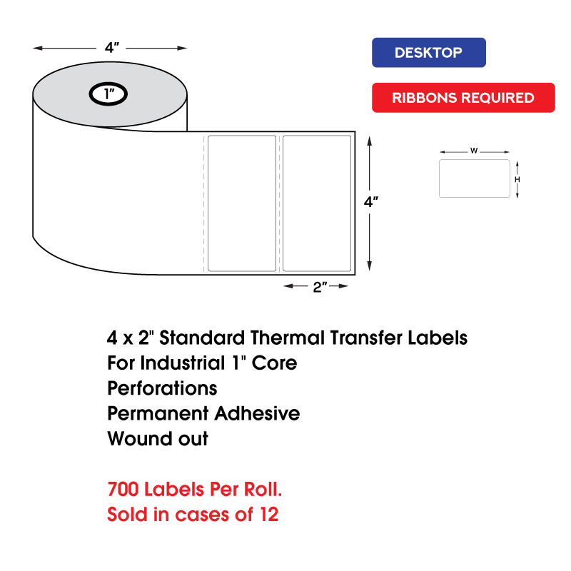 4″ x 2″ Standard Thermal Transfer Labels on 1″ Core, Perforations, Wound Out, Permanent Adhesive (700 Labels Per Roll)