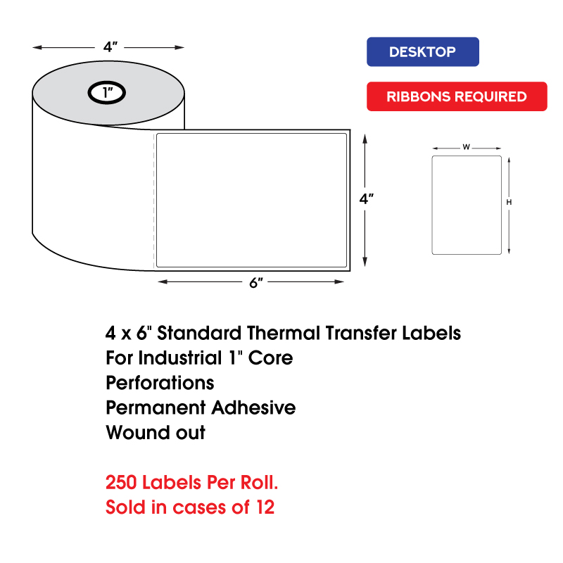 4″ x 6″ Standard Thermal Transfer Labels on 1″ Core, Perforations, Wound Out, Permanent Adhesive (250 Labels Per Roll)