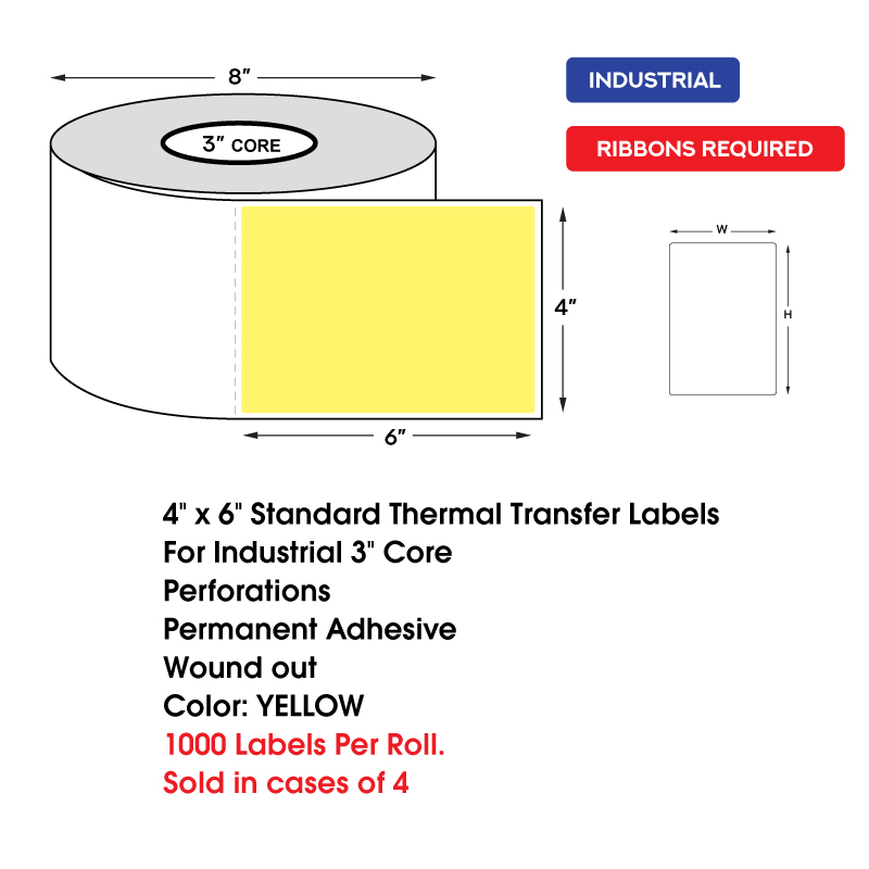 4″ x 6″ Standard Thermal Transfer Labels on 3″ Core, Perforations, Wound Out, Permanent Adhesive, COLOR: YELLOW (1000 Labels Per Roll)